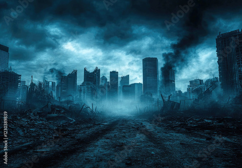 Post-Apocalyptic Cityscape with Foggy Atmosphere and Urban Decay