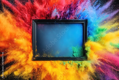 Poster mockup for Holi Festival among colorful powders, blank copy space for ads