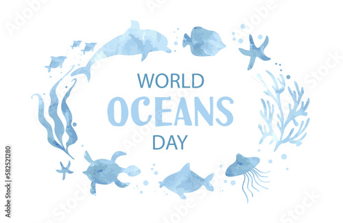 Poster of World Ocean Day.Elements underwater ocean in watercolor style. Vector illustration