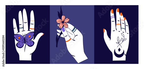 Posters with witch hands set. Astrology and tarot cards. Arms with tattoes with flower and butterfly. Mysticism and esotericism. Magic and witchcraft. Linear vector collection