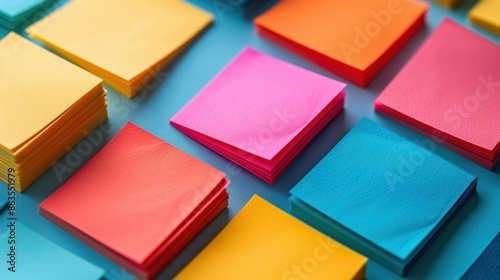 Post-it notes in vibrant colors, neatly arranged on a simple white background.