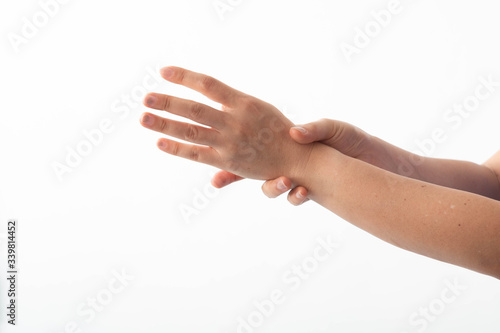 Posture to wash hands thoroughly with alcohol gel. Clean hands to prevent infection from the corona virus. Covid-19 on a white background