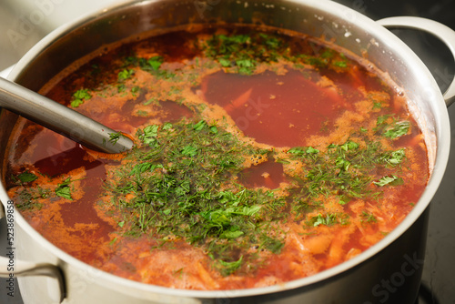 Pot of freshly cooked ukrainian borscht on a kitchen stove.
