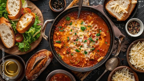 Pot of Lasagna Soup with Bread and Salad on a Rustic Table