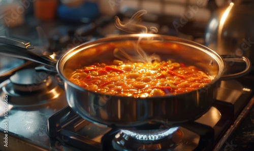 Pot of soup on the stovetop, 4K hyperrealistic photo