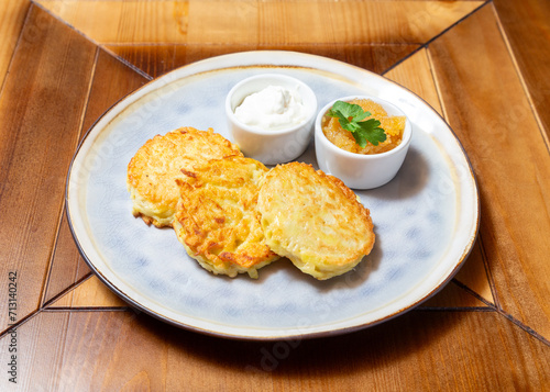 Potato cutlets with sour cream. On a wooden table.