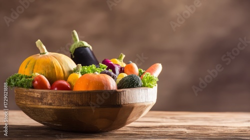 potato. Fresh autumn vegetables arranged in a wooden bowl, showcasing vibrant colors with an earthy backdrop. representing seasonal cycles and harvest abundance.