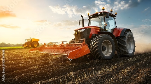 Potato Harvest in Progress with Modern Farming Machinery Working in Scenic Rural Field Under Sunny Sky Capturing the Essence of Analog Color Scheme and Digital Tone