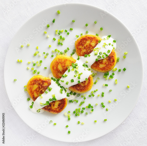 potato patties with sour cream decorated with green onion