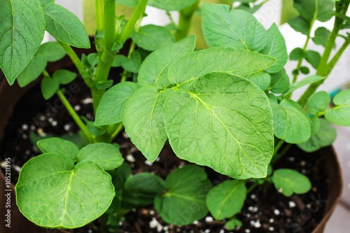 Potato plant growing in home garden in spring