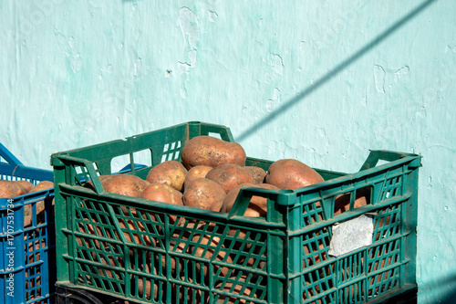 Potatoes are piled in green crates, recently harvested, resting against a vibrant blue wall under bright sunlight