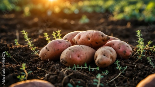 Potatoes Resting on Soil in Field at Sunset with Young Plants