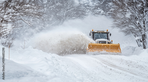 Potężny pług śnieżny toruje sobie drogę przez zasypaną śniegiem trasę, wyrzucając biały puch na boki, podczas gdy burza śnieżna ogranicza widoczność.