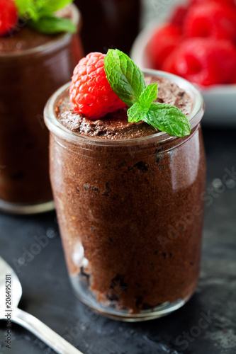 Pots Of Dark Chocolate Mousse With Raspberries