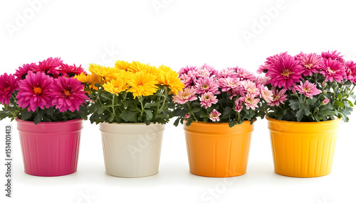 Pots with beautiful colorful chrysanthemum flowers on white background