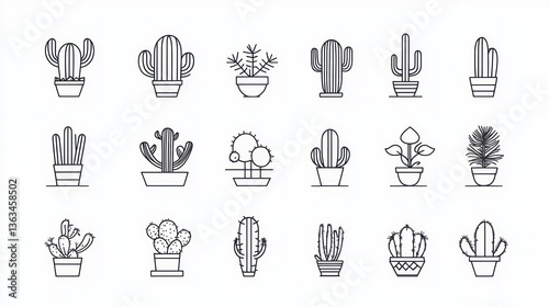 Potted cacti and succulents collection; home decor; minimalist line art; white background; design element
