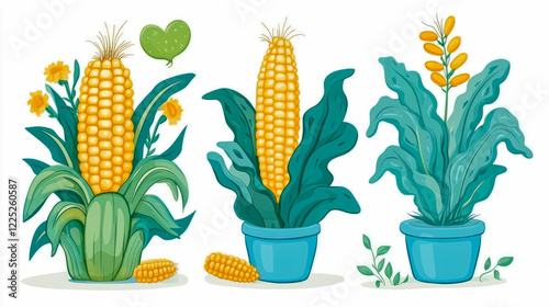 Potted Corn Plants and Flowers: A Vibrant Botanical Illustration