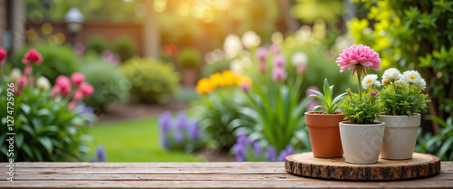 Potted flowers on a wooden table with vibrant blooms, creating a serene and inviting outdoor atmosphere amidst a lush garden backdrop