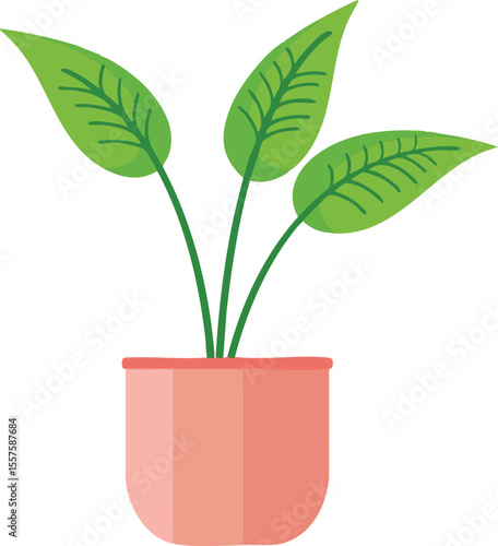 Potted plant illustration displays fresh green leaves in a stylish pink pot against a white background for simple home decor.