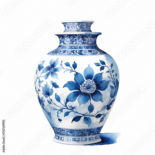Pottery. Blue and White Porcelain on white background. Chinoiserie art