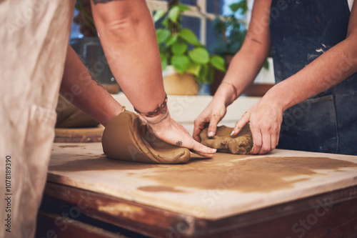 Pottery, teamwork and clay with hands in workshop for partnership, small business and creative. Sculpture, production and art process with closeup of people for gallery, ceramic and talent together