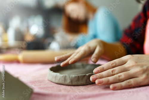 Pottery workshop class. A pottery crafts dish from a raw clay. Creating ceramics