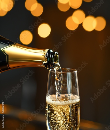 pour champagne from a bottle into a glass, dark background. holiday concept, postcard. free space