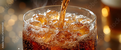 Pouring Brown Carbonated Drink with Ice Cubes in Glass