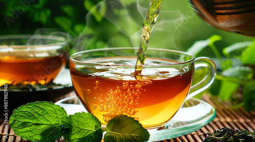 Pouring Fresh Herbal Tea into Glass Cup in Scenic Outdoor Setting with Steam and Mint Leaves Highlighting Health and Relaxation Concept