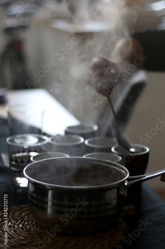 Pouring homemade hot black coffe from large metal pot. Selective focus.