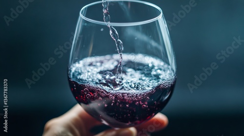 Pouring rich red wine into a glass creating bubbles and reflections in dim light