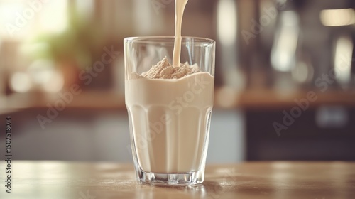 Pouring Vanilla Protein Powder into a Glass of Milk