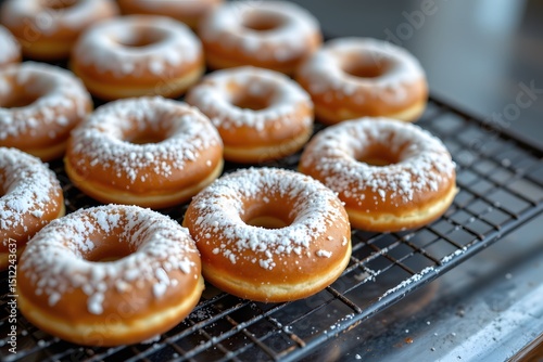 Powdered Donuts Fresh From Rack: Indulge in the delectable allure of freshly baked donuts, generously dusted with powdered sugar. These sweet treats cool on a rack.