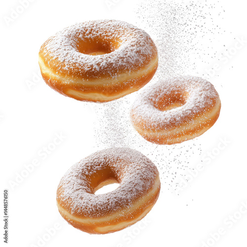 Powdered Sugar Donuts Descending Mid Air isolated on a transparent background