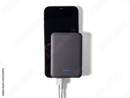 Power bank for charging mobile devices on a white background. Smartphone charger with power supply. External battery for mobile devices.