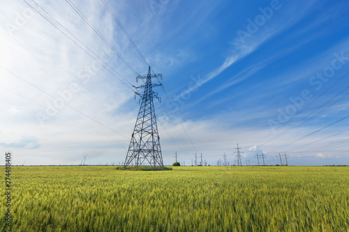 power line summer landscape / passing overhead electricity wire of the support carrying the light and the heat in the house