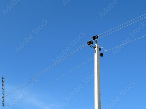 Power line support isolated on blue sky background. Power pole with electrical wires and capacitors, electricity concept