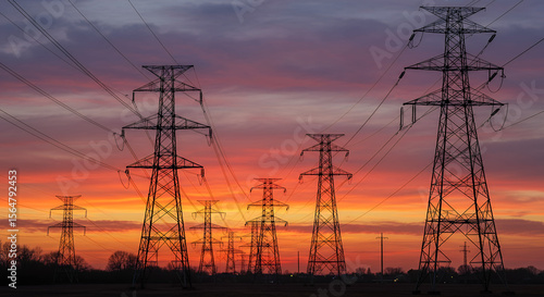 Power Lines at Sunset: Electric Towers Silhouetted Against a Fiery Sky