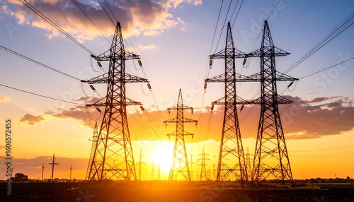 Power lines silhouetted against a vibrant sunset and cloudy blue sky