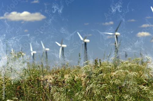 Power of wind turbine generating electricity clean energy with background on the sky.