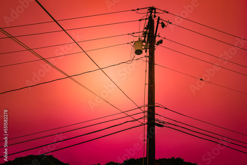 Power poles and lines, or electricity pylons and cables at sunset, abstract geometry of the shapes and lines against moody smoggy sky in Los Angeles, California