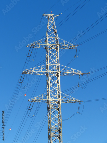 Power poles in the blue sky. Electrical transmission pylon. High voltage.