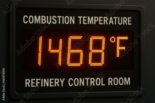 Power Production Hydrocarbon concept. Digital display showing combustion temperature in a refinery control room.