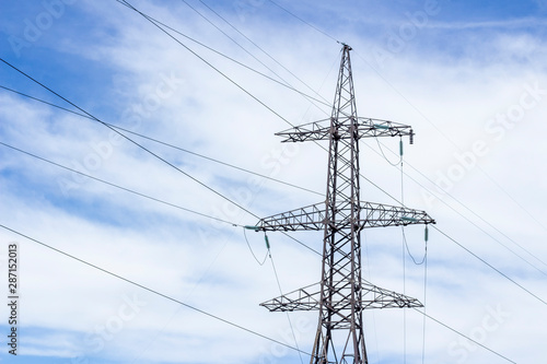 Power Tower. High voltage lines and power pylons. High voltage power lines installing on high electric post connected
