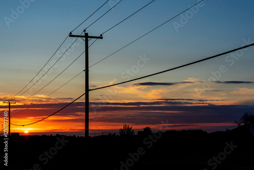 Power transmission line poles against the sky at sunset