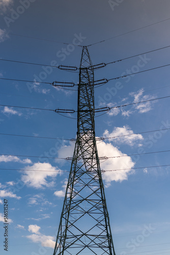 Power transmission tower with blue sky as background. Air electric lines.