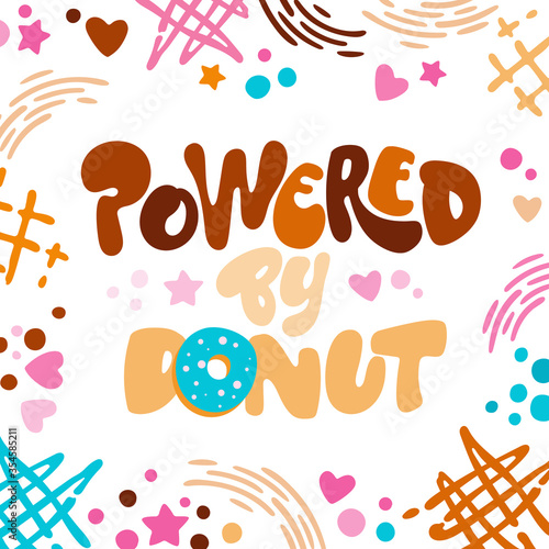 Powered by donut - funny pun lettering phrase. Donuts and sweets themed design. Flat style vector illustration.