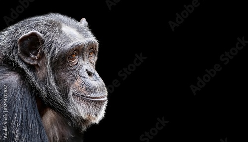 Powerful and Regal Chimpanzee Portrait on a Solid Black Background, Highlighting the Majesty of these Intelligent Primates.
