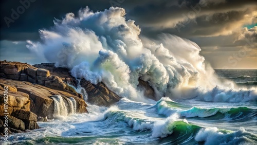 Powerful Atlantic Ocean wave crashes against rocky coastline during severe storm , crashing waves