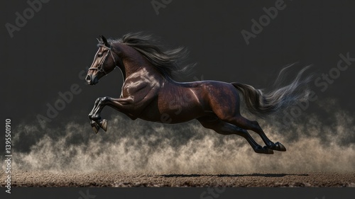 Powerful brown horse galloping through dust, a display of strength and grace.